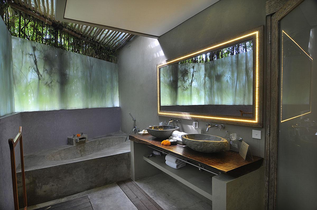 A large semi open air bathroom area, hand shower, head shower, magnifying mirror, bathroom amenities, Bathrobe