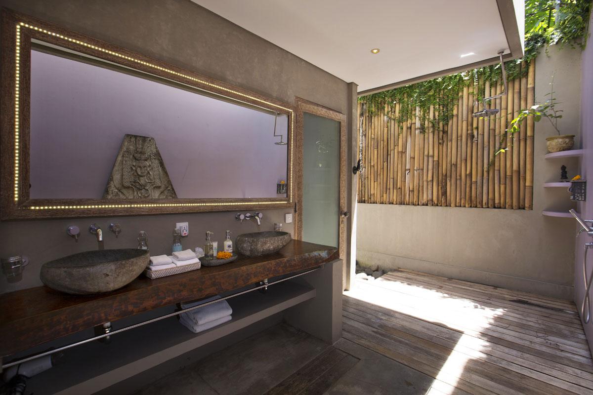 Semi open air bathroom area, hand shower, head shower, magnifying mirror, bathroom amenities, Bathrobe